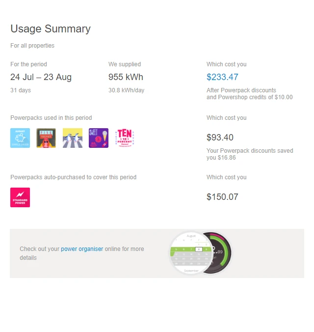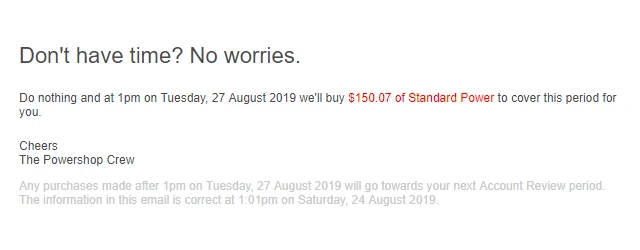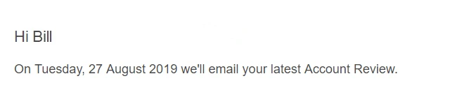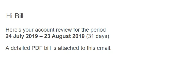 Your Account Review is a monthly email summarising your power usage, Powerpack purchases and savings, and what (if any) you still have to pay on your account. Why don’t we call it a bill? Because if you have been buying power as you go, you may not have anything left to pay!