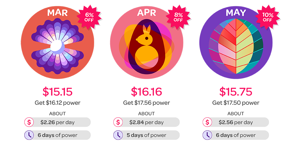 Future Packs allow you to squirrel away power for the months to come. The further out you buy Future Packs, the bigger the discount on your Standard Rate (for the amount of power covered by that Future Pack). Buy a Future Pack six months in advance to get the maximum 10% discount, five months out and get 8%, four months out and get 6% and so on.