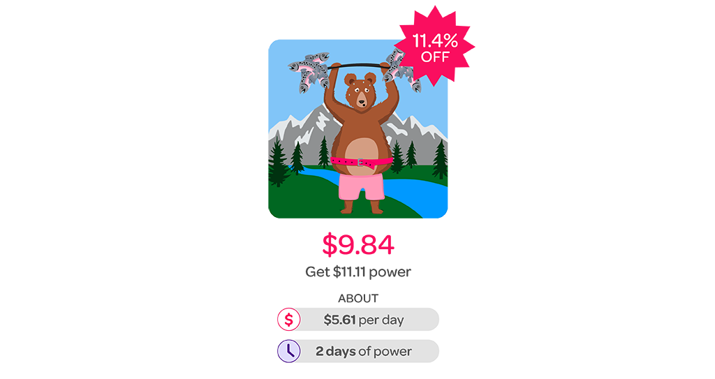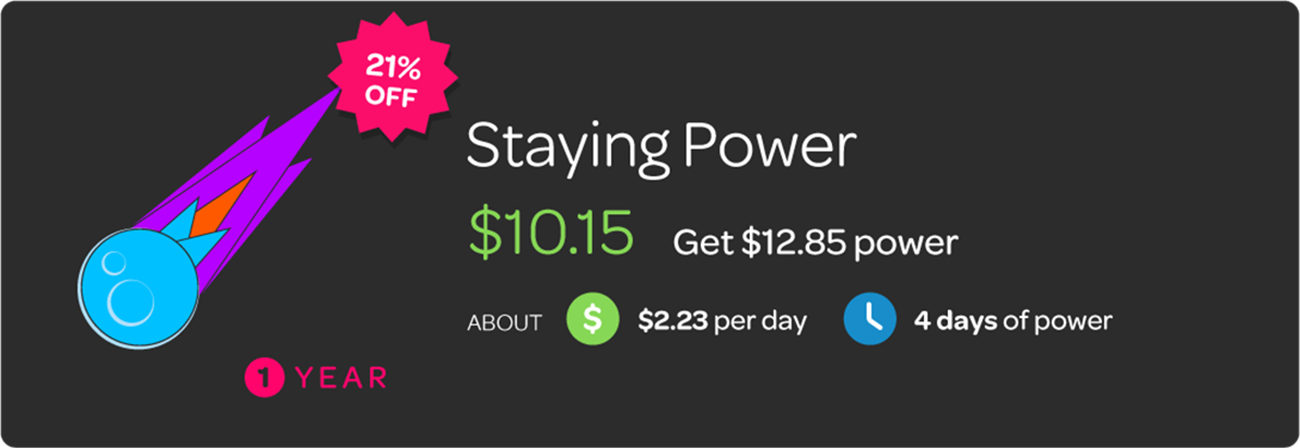 Released on the first of every month, the Staying Power powerpack has the biggest discount out of all our Powerpacks and stays in your Shop all month so you can grab it when it suits you. Staying Power rewards customers for loyalty, so the longer you’re a customer, the bigger the discount you get! Hell yeah, that’s right, we reward you for your loyalty! The discount is off your Standard Rates* (based on your estimated usage) and starts at 20% for newbies and goes up 1% every year to a max of 25% after five years!