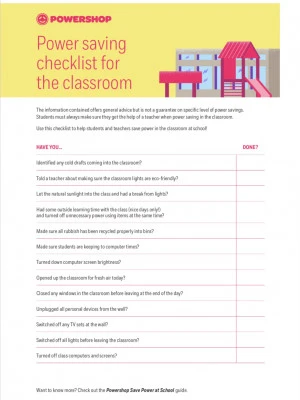 - Print out the power saving checklist for classrooms under our resources section. Put this on the wall (and if you can, have it laminated for repeat use).
